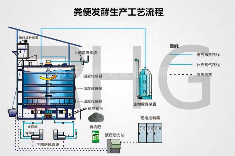 在养殖粪污转化为有机肥的进程中,有机肥发酵罐和发酵风机是是关键。有机肥发酵罐是在一定条件下通过微生物的作用,加之不断的输送中的氧气,使有机物不断被降解和稳定,并产出一种适宜于土地利用的产品的过程。型号;RHG910-7H2
